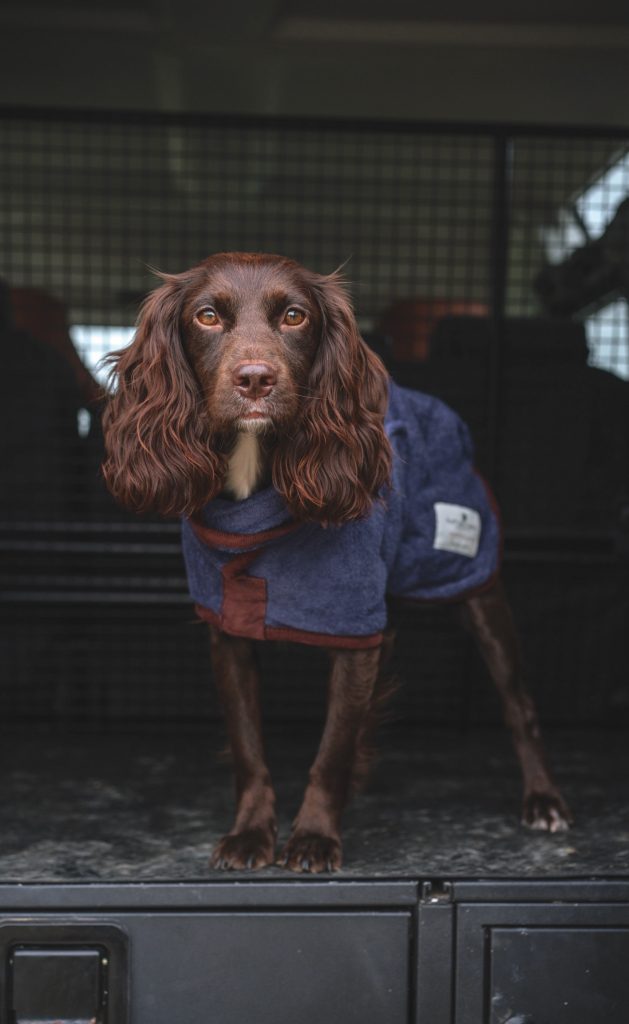 Keep your gundog warm and clean with the Ruff and Tumble Drying Coat. Made from double-thickness natural cotton towelling, it wicks moisture without chilling your dog.