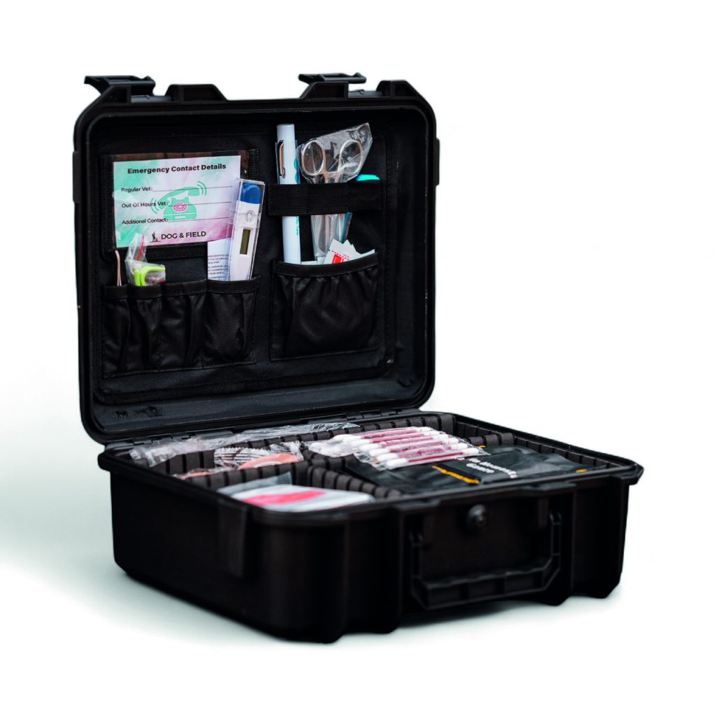 The Dog & Field First Aid Field Trauma Kit is essential for shoot days. In a rugged, waterproof pouch, it carries sterile gauze, wrap, trauma scissors, antiseptic wipes, dog tourniquet, Celox packs, gloves, and hot/cold packs.