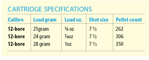 The cartridge specifications table here shows the pellet count for each load value, as well as the loads in ounces and grams, which are all based on a 12-bore 7½ shot size. There is a very interesting point in relation to pellet count and when you look at the number of pellets that break the average clay pigeon target, it can be quite an eye opener. My view is – that number is six… yes, only six! So when you think about how many you have in your cartridge, one could ask you “how many more do you need?”