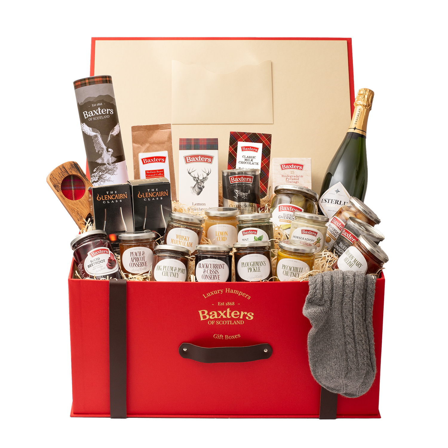 Brimming with 25 artisanal delights, this is Baxters’ grandest hamper – a royal gift that truly exceeds expectations. Inside the striking signature red box, the winner will discover a treasure trove of premium treats, including a bottle of Champagne Brut Éclat, an 8-year-old Speyside Single Malt Whisky, and a handcrafted Darach whisky barrel glass stand with two Glencairn crystal glasses.