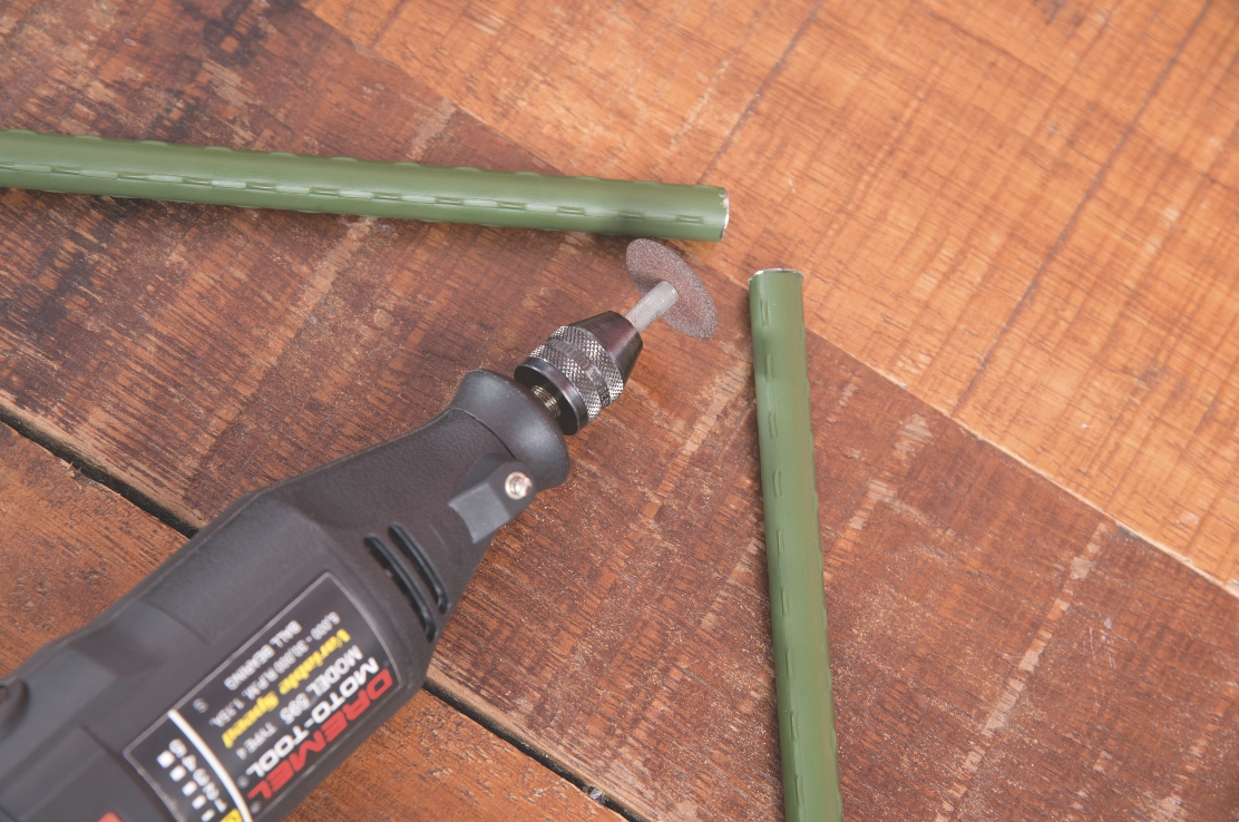 The next job is to assume your shooting stance and cross the sticks in front of you, working out the height you’ll need. I’m 6ft tall and ended up cutting my sticks down to 100cm each, but the great thing about fabricating a homemade product like this is the fact that it’s tailored exactly for you. My sticks were cut to size with a Dremel tool fitted with a cutting disc (Cut-Off Wheel No. 409), but a hacksaw would work just as well.