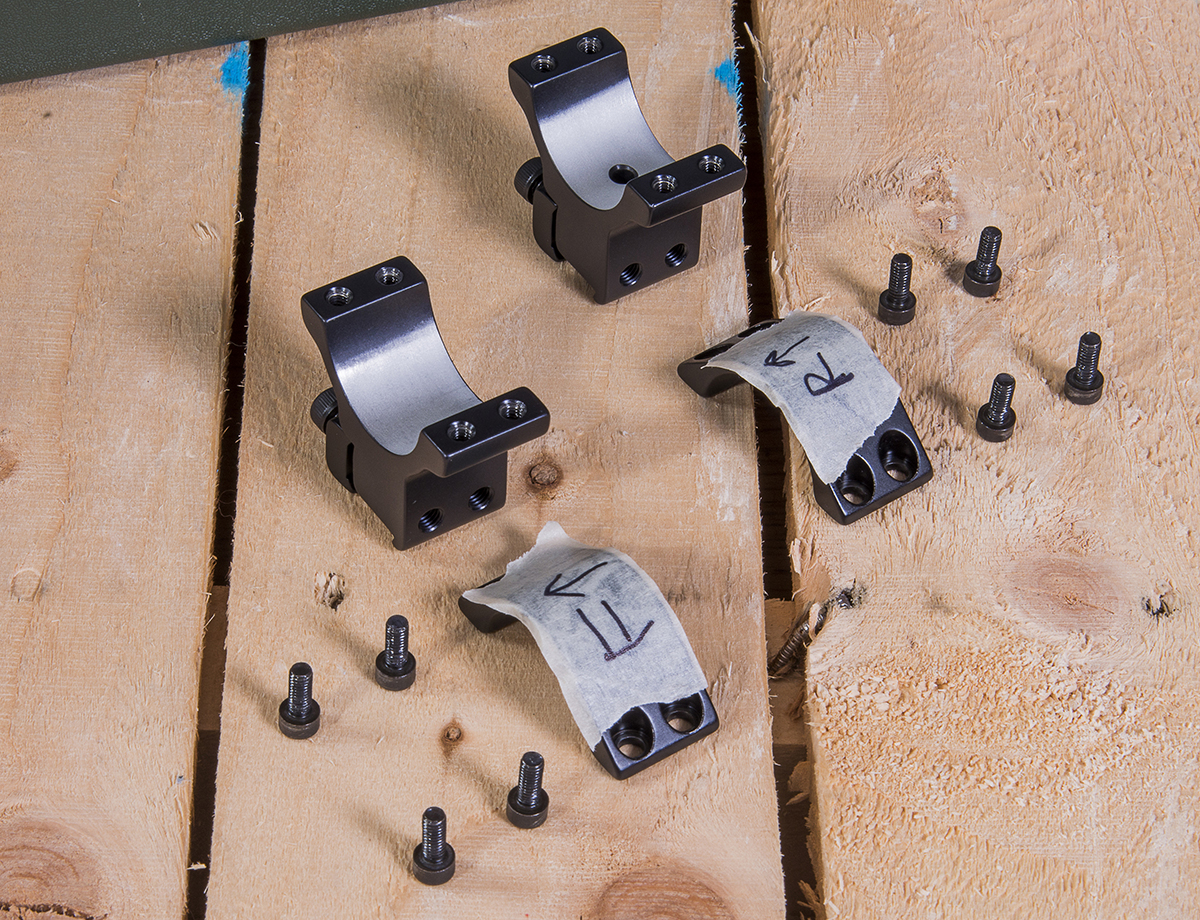 Having purchased the correct mounts for your needs, it’s time to begin prepping them by unscrewing the upper rings and loosening the base screws. I always like to put the ring screws back in exactly the same holes they came out of, and also take care to match the upper rings to the bases they came off, even going so far as to keep the direction the same. It can help to use a piece of masking tape to do this, marked ‘F’ and ‘R’ for front and rear, along with an arrow that shows which is the front face of each upper ring. This way, everything will be reassembled exactly the way it came. In theory, the parts should be interchangeable, but depending on make, they won’t necessarily fit perfectly if they’re moved around.