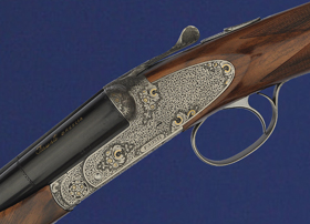 The engraving has been carried out by hand and is signed by the craftsman on the bottom of the gun near the trigger guard. It is generally very successful and much of the gun features bold foliate patterns sweeping across large swathes of metal, which are striking though perhaps lacking in a little detail. However, the game scene vignettes on each sideplate have been beautifully applied. The flushed grouse and fighting cock pheasants feature some very fine detail indeed and the moorland scene of the lefthand plate offers delightful subtlety.