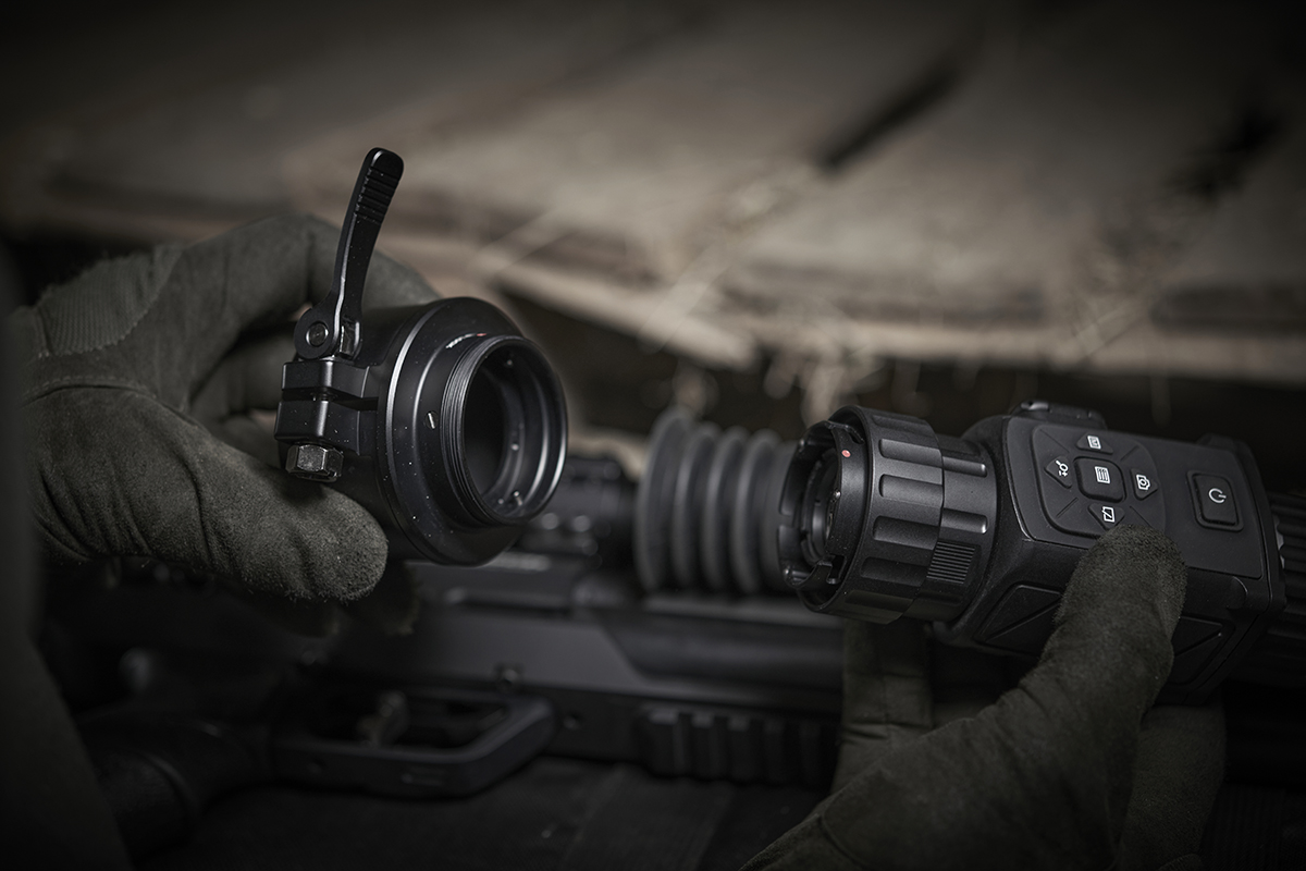 To switch to front-mounting, you need to unscrew the spotter/gunsight eyepiece and swap it for the clip-on lens system. When the new lens is screwed in, the unit is able to recognise the change and automatically optimises its functionality for the different task.