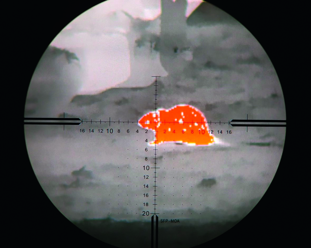 The biggest advantage provided by thermal optics is that it is almost impossible to fail to see your quarry’s heat signature when looking through them. And of course there is absolutely no light to blow your cover. Thermal cameras are generally regarded as night shooting tools, but even in daylight the glow of an animal’s body heat is virtually unmissable when viewed on a thermal display – even when partly obscured by undergrowth. This makes these optics very effective for spotting, and they certainly enable you to see a lot more than you would with IR when scanning the darkness for signs of quarry.
