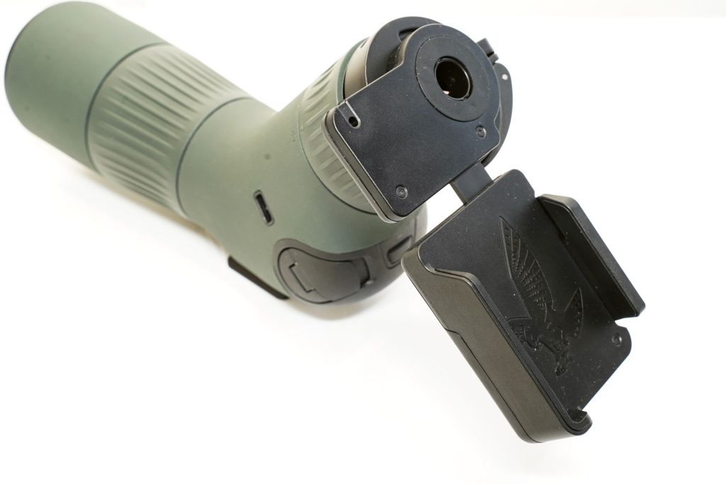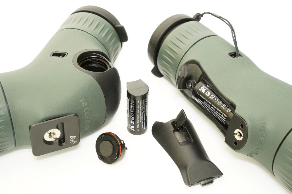 You get instructions, a lens cloth, a carrying strap, an ARCA tripod adapter, a USB-C-compatible charger with a cable, and a 1,860mAh rechargeable battery. Each spotter is fitted with a black captive rubber lens cap for the eyepiece and a solid ‘pinch-to-remove’ cap for the objective lens.