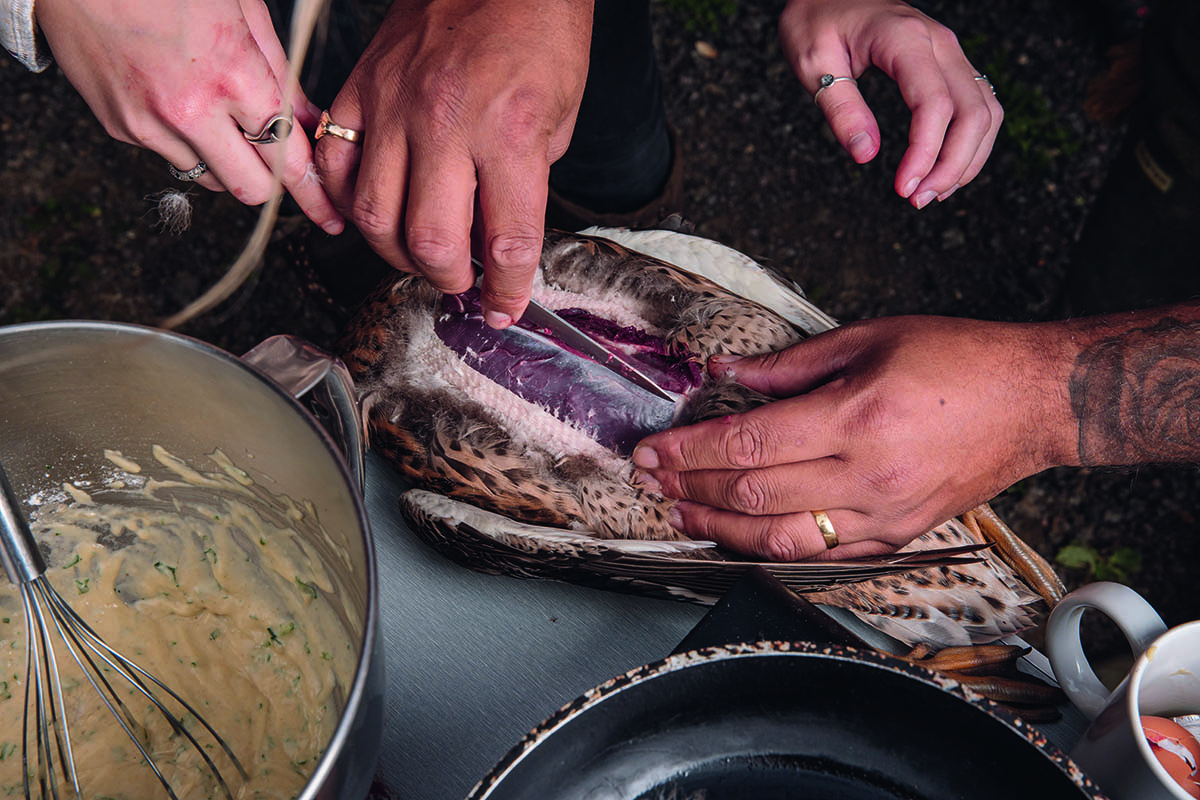 Making the cut larger in the skin revealed both breasts on the crown, then I moved my fingers down towards the mallard’s legs. I’m a chef who does not like waste but also considers the practicalities of time constraints. I used a solid pair of scissors to cut through the leg bone just above the foot joint under the skin, then used a sharp knife to cut out the leg, saving them for another day. I then used a sharp knife to take each breast fillet off the crown. Expertly done by Roma too, I must say.