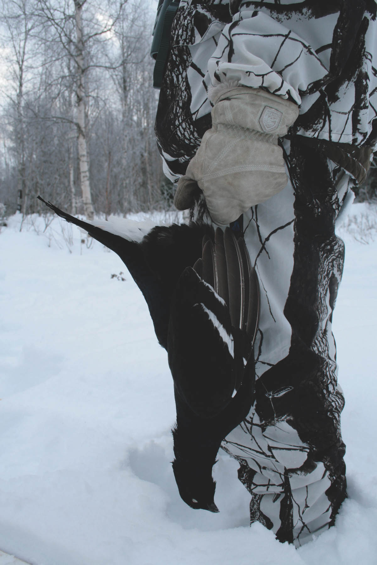 Wictor stays back, I take off my skis and immediately sink up to my waist in the soft snow. The final 50 yards takes an age as I huff and puff my way through the drifts of snow. Red-faced, I am at last close enough for a shot. No need to find anything to rest the rifle on, you just sink solidly into the snow and steady the crosshairs on the small white patch that decorates the top of the wing.