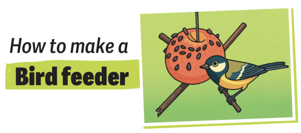A fun and easy project is to make an apple bird feeder. It is a great way to use up leftover apples from the garden, or those which become bruised in the fruit bowl and you can take something which may have been thrown away and turn it into something the birds will love. It’s a really simple process, and all you will need is an apple, a sturdy twig, some twine or string and some sunflower seeds